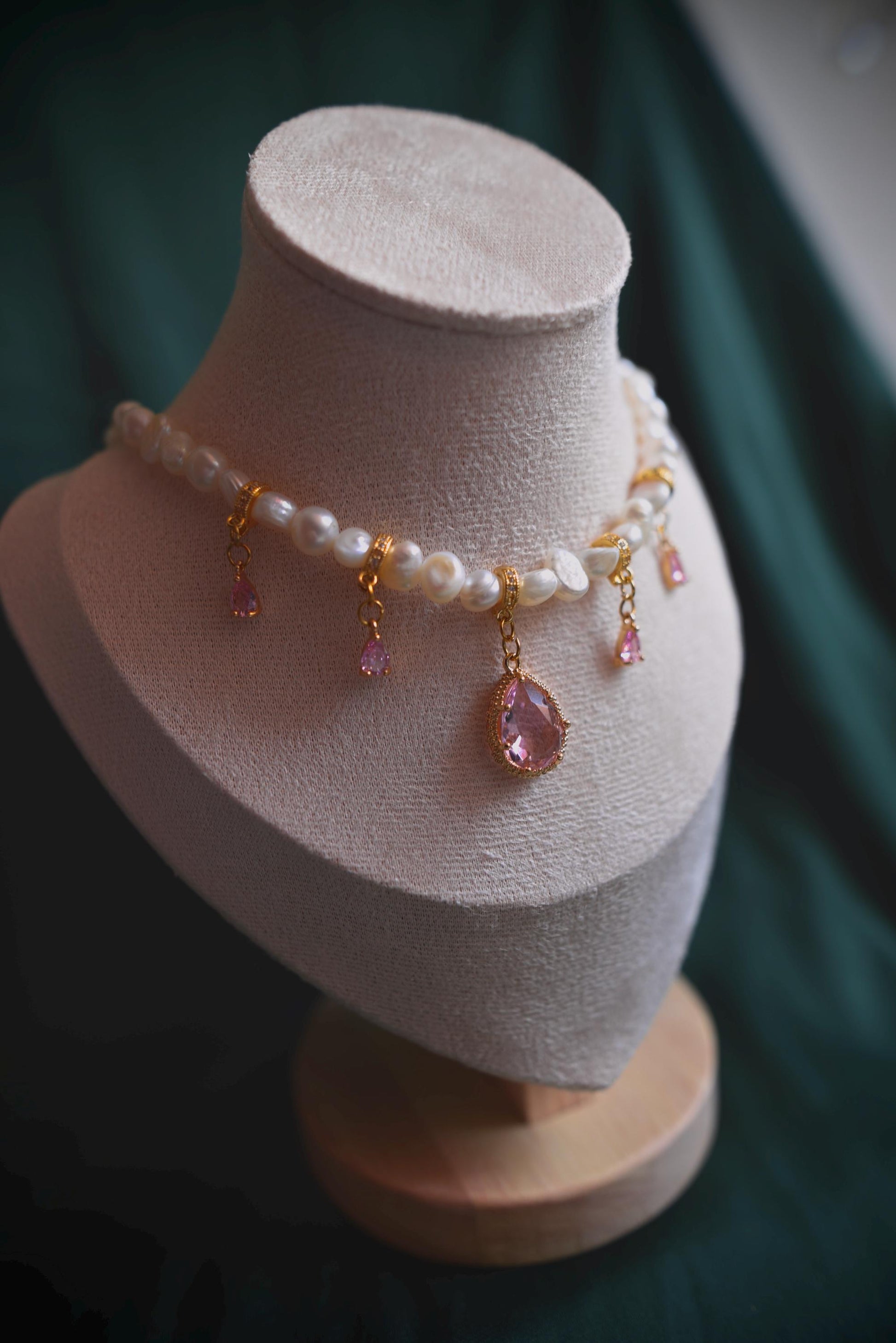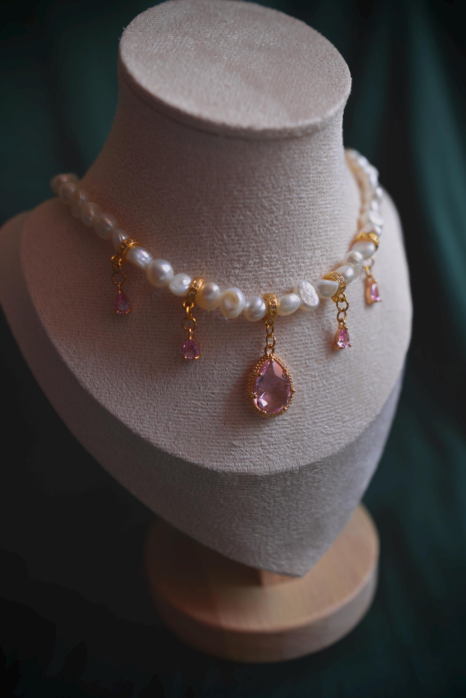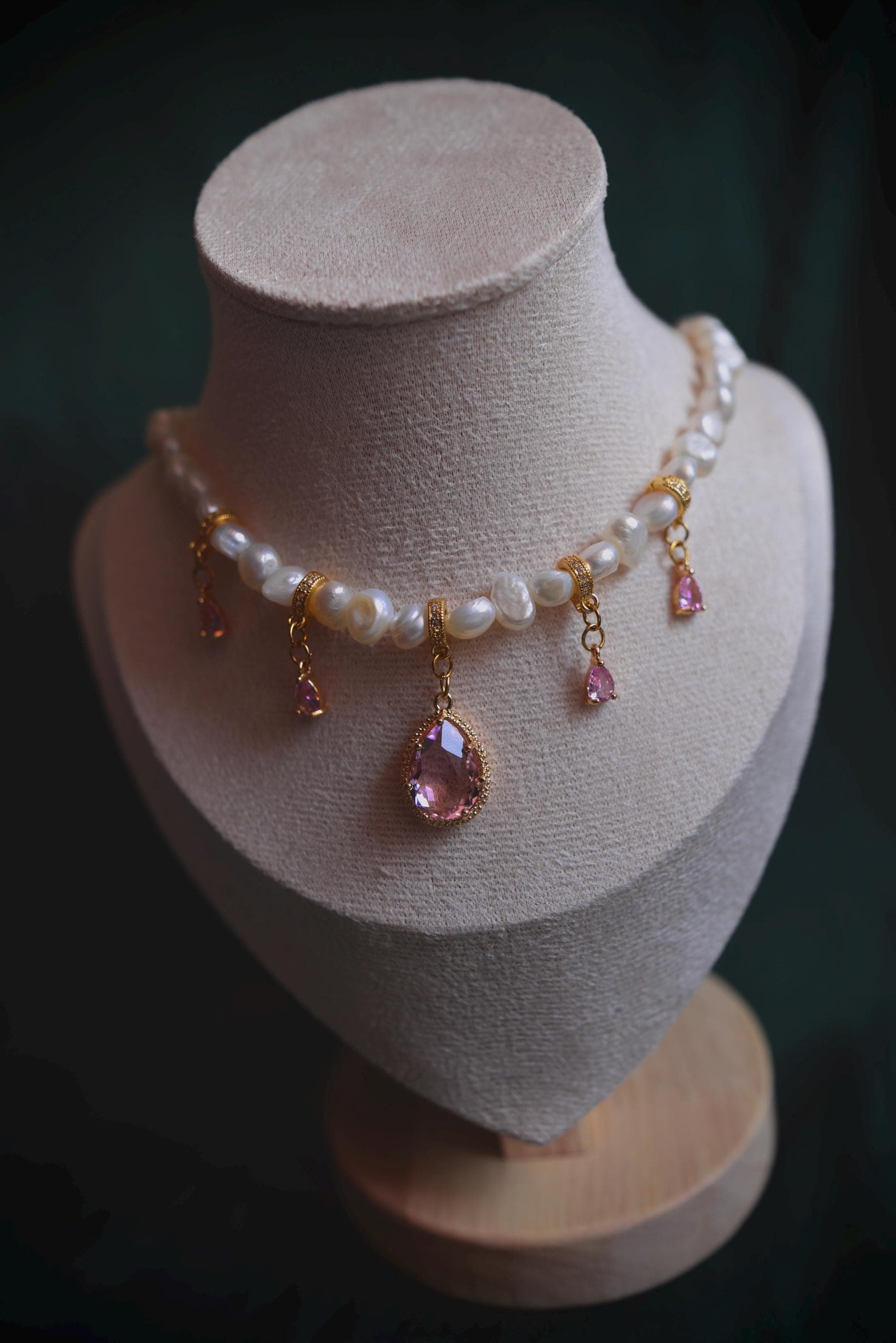 Barocke Süßwasserperlen, begleitet von sanften Rosétönen, die das Licht leise auffangen.