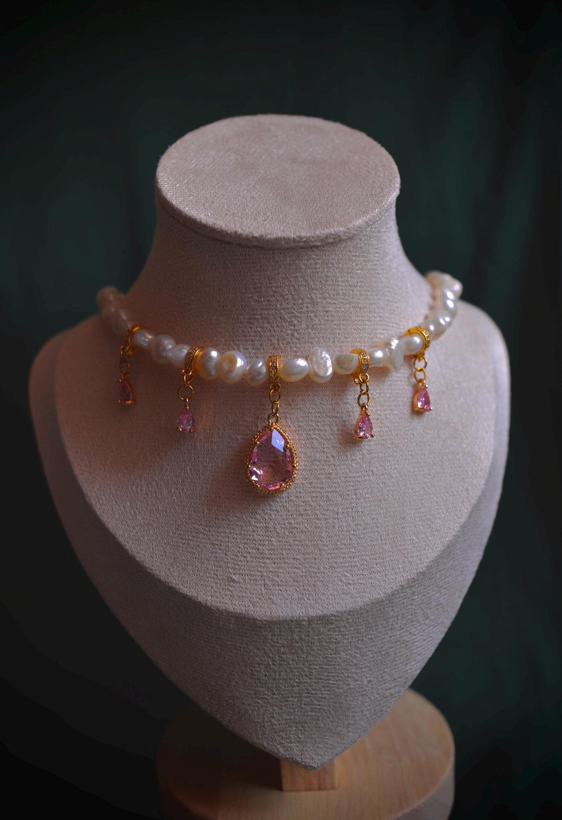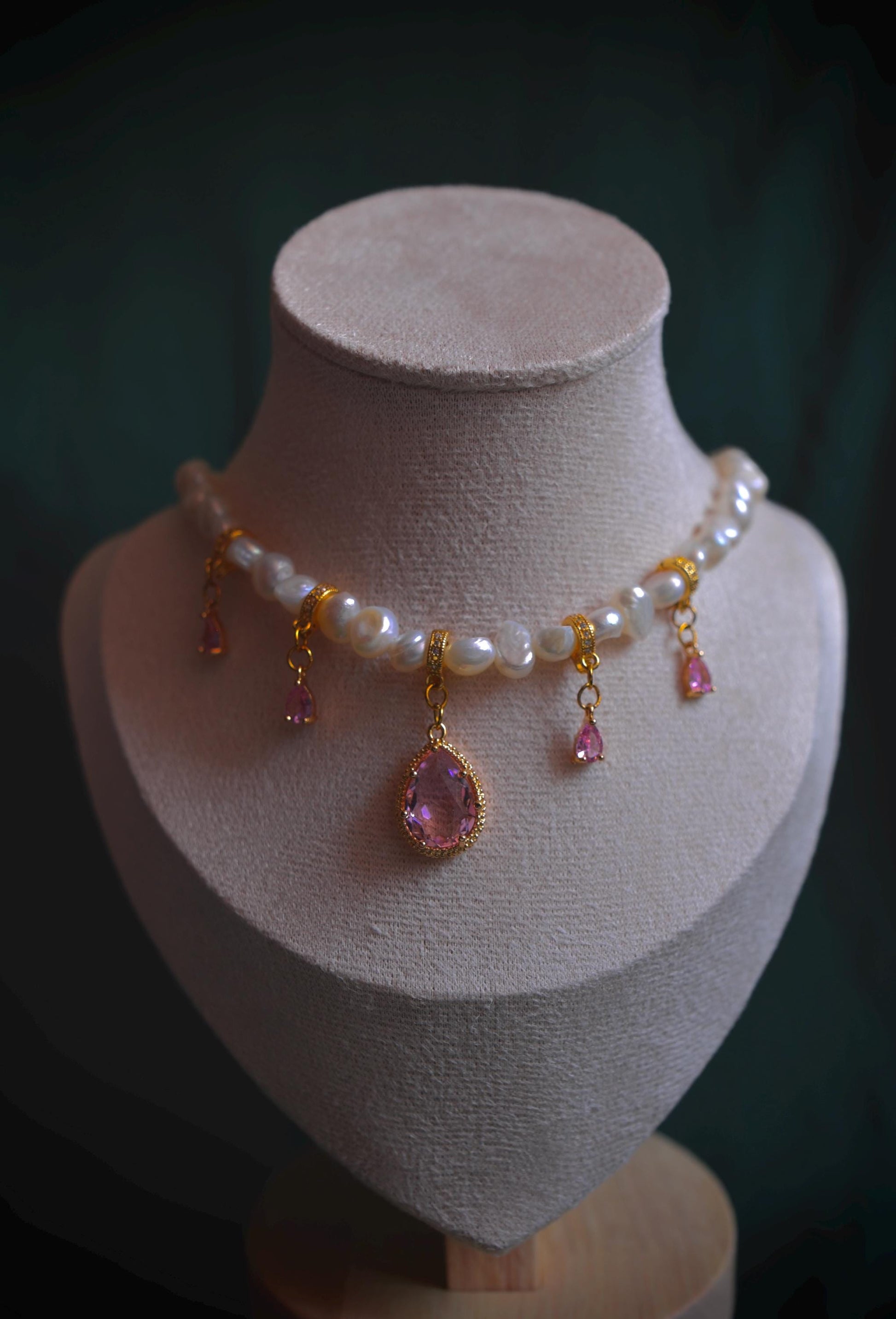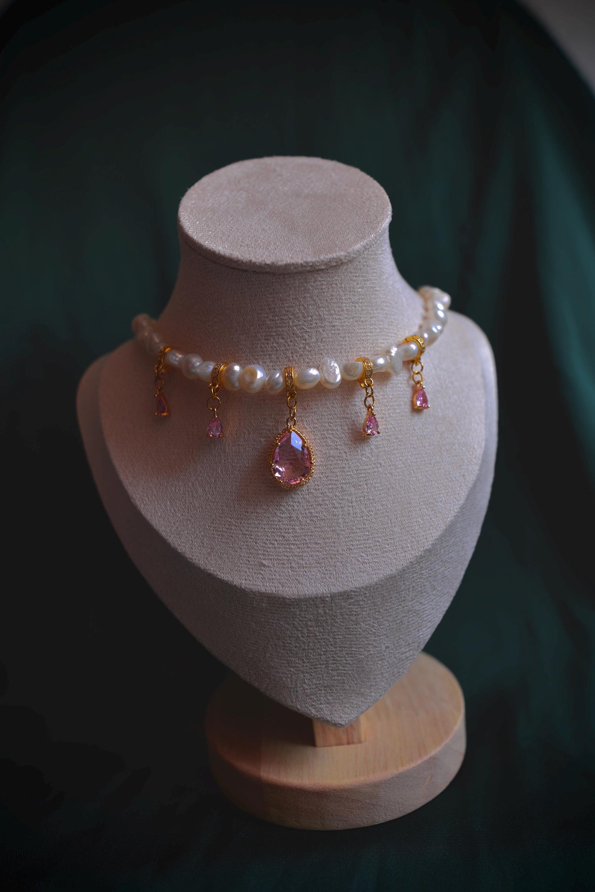 Barocke Süßwasserperlen, begleitet von sanften Rosétönen, die das Licht leise auffangen.