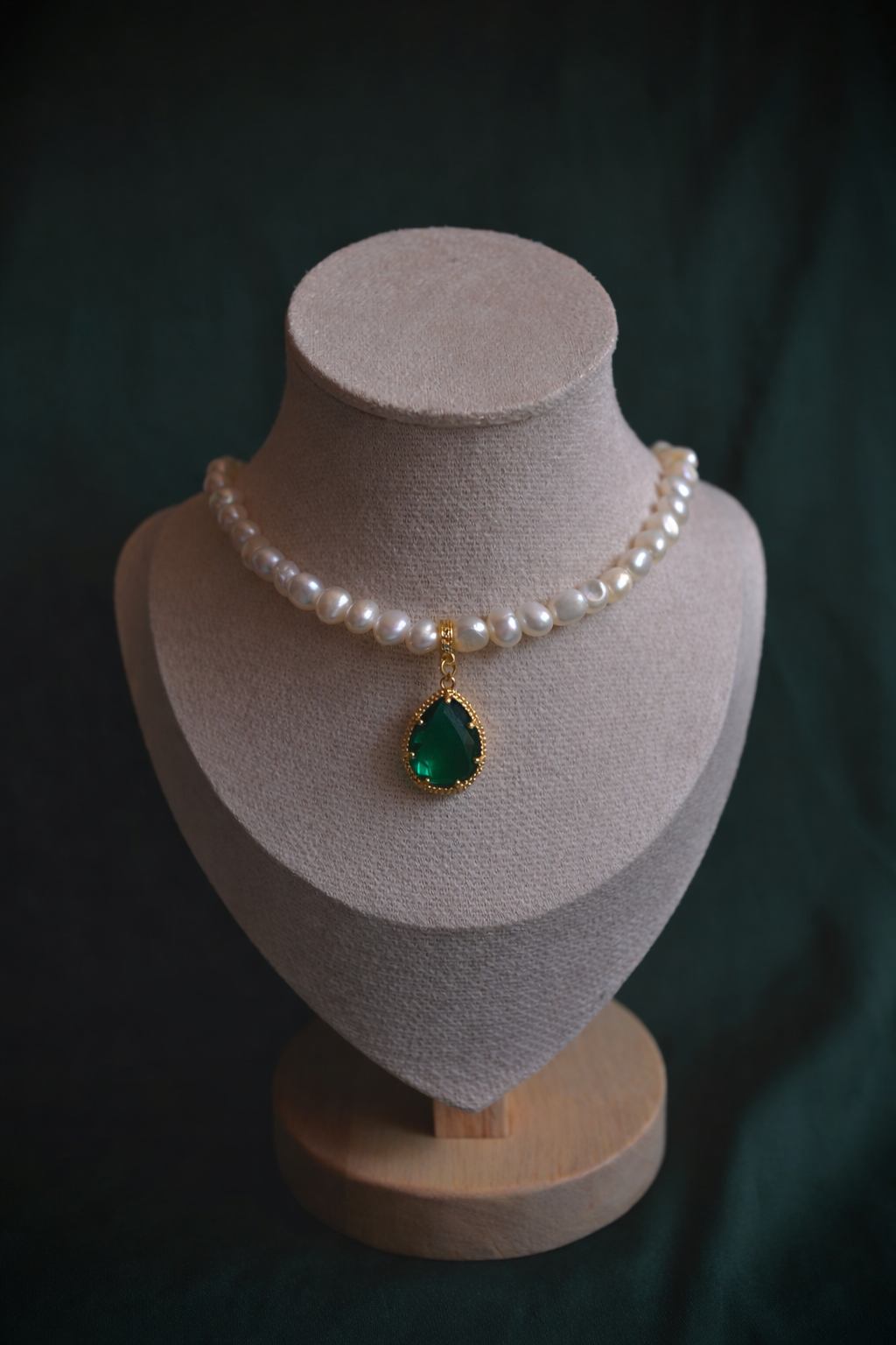 Freshwater pearls held by deep emerald green - a color long associated with clarity, endurance, and quiet dignity.