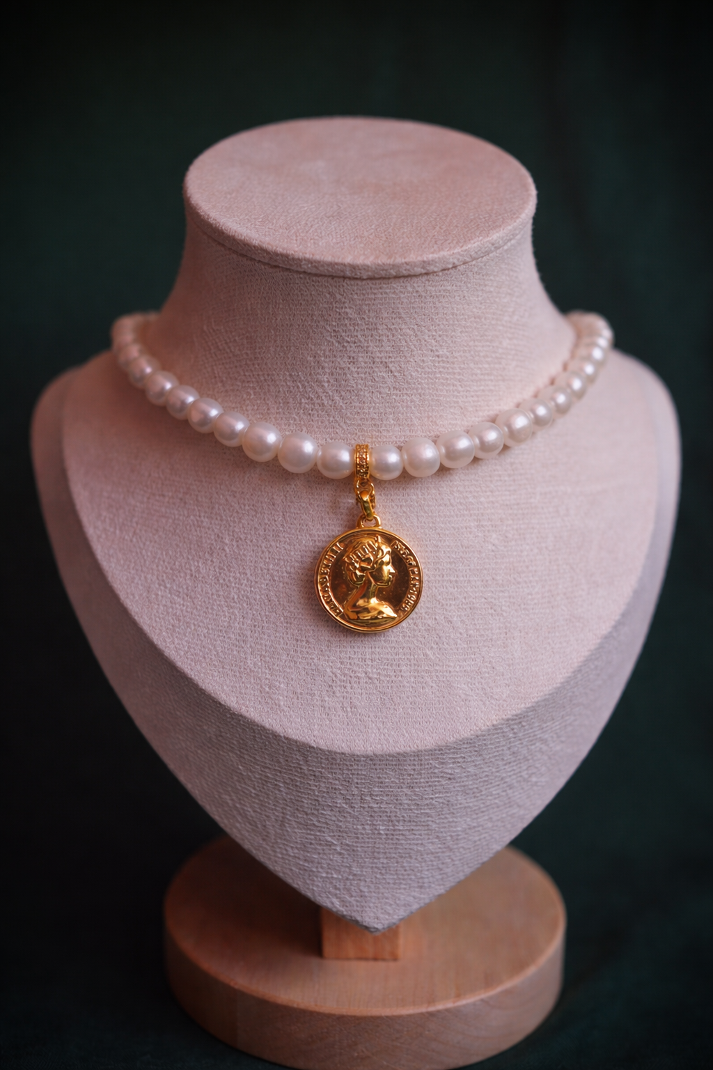Freshwater pearls accompanied by an antique-gold portrait medallion - quiet, dignified, and carried by memory.