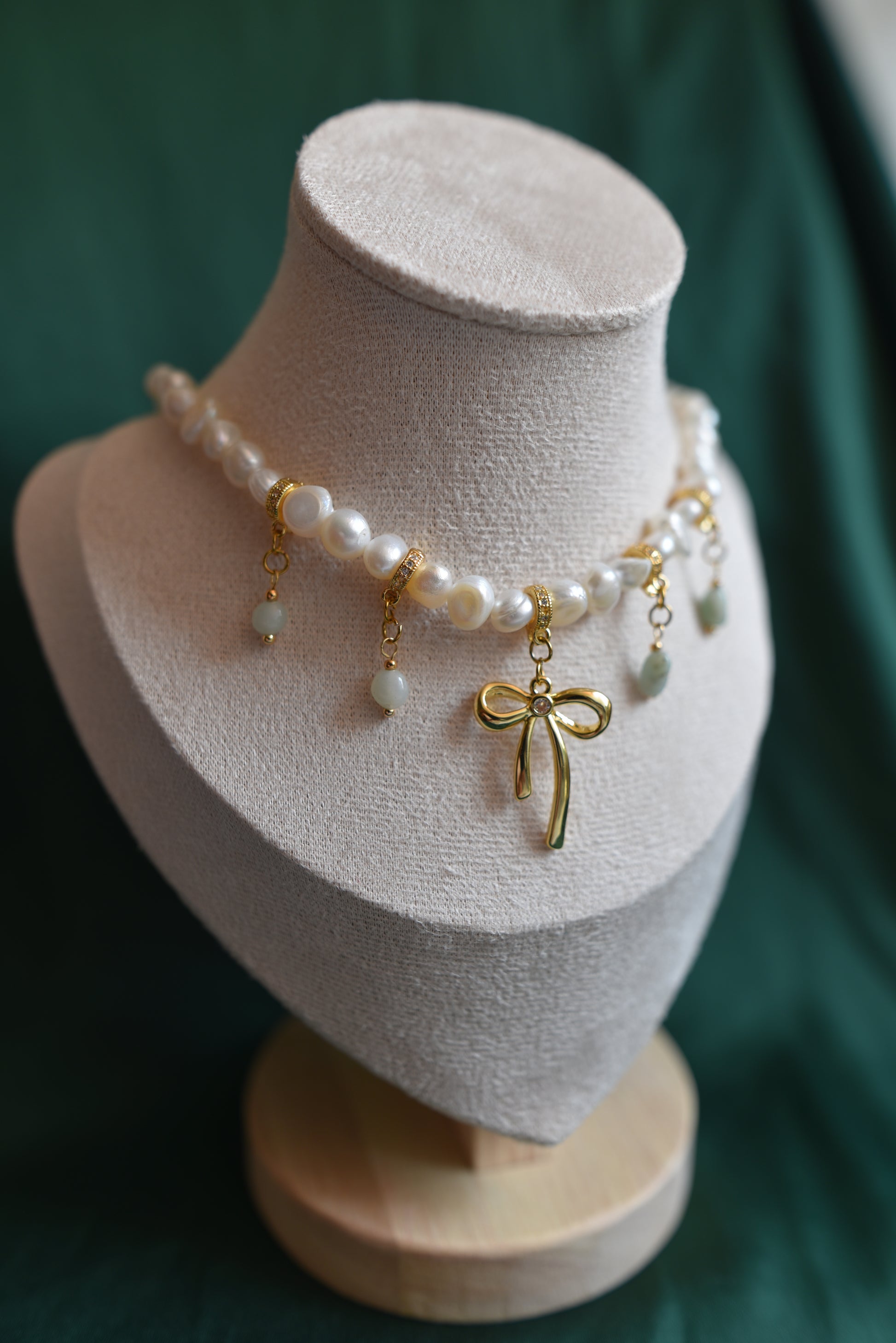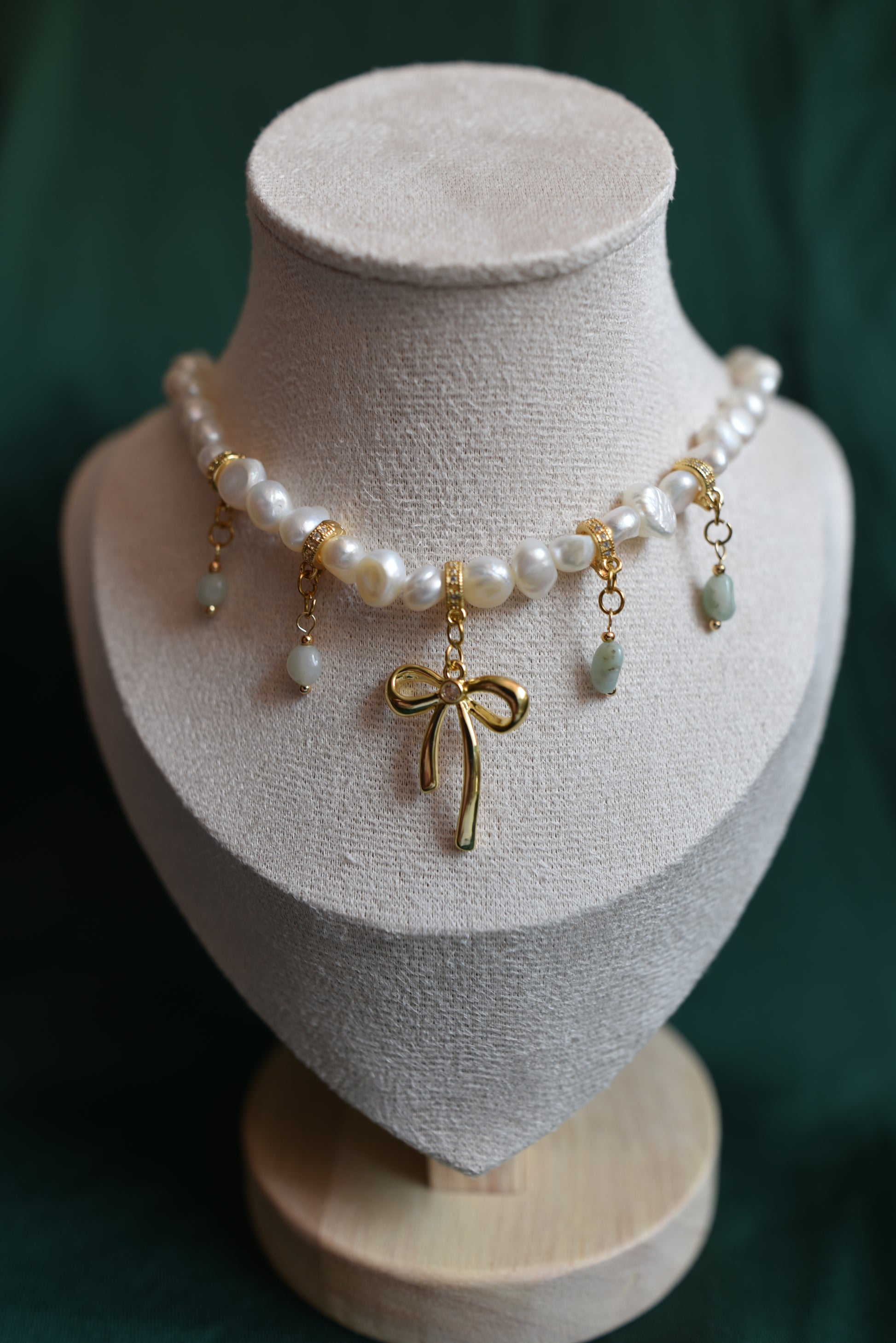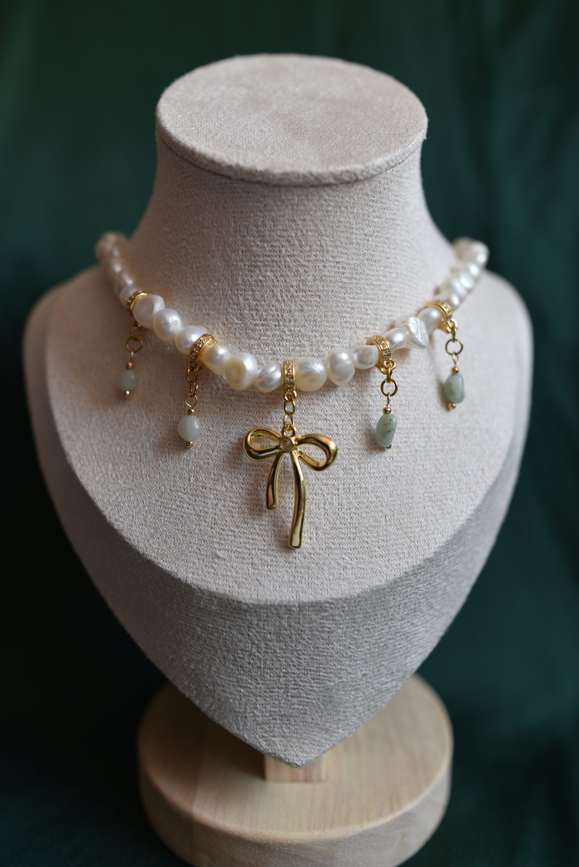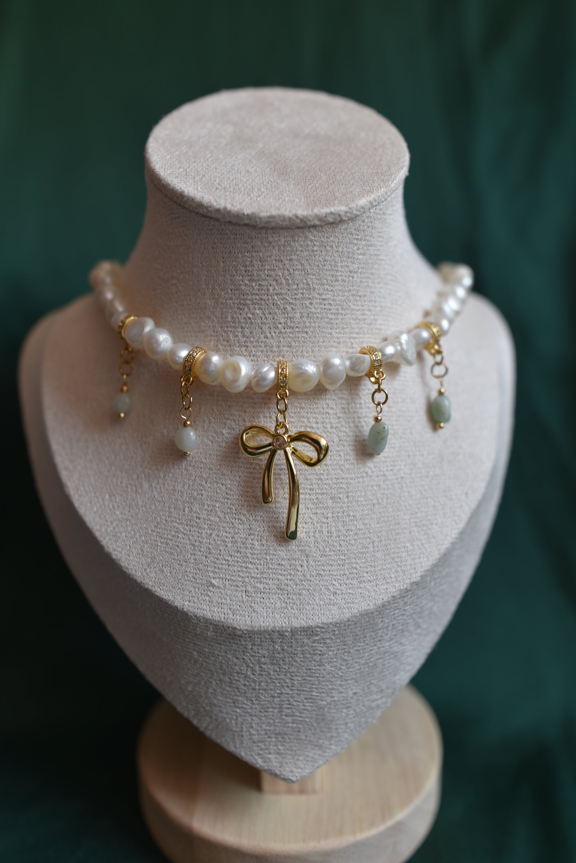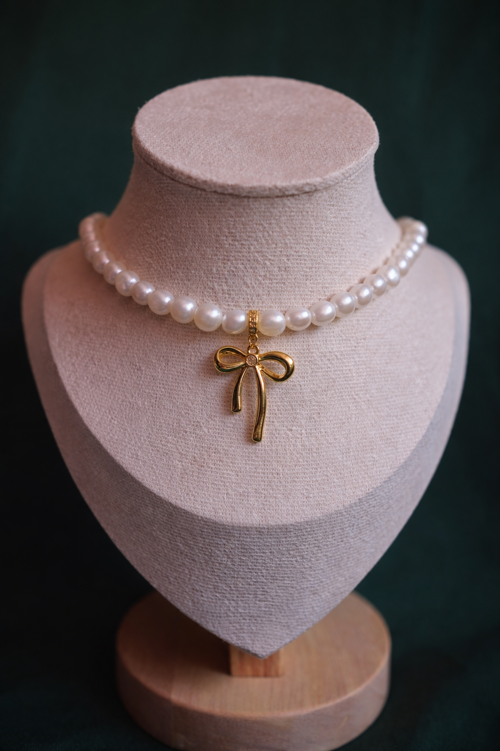 Handcrafted with genuine freshwater pearls, each pearl is chosen for its soft, natural luster and organic character. A delicate gold bow at the center adds a subtle touch of femininity - refined, graceful, and timeless.