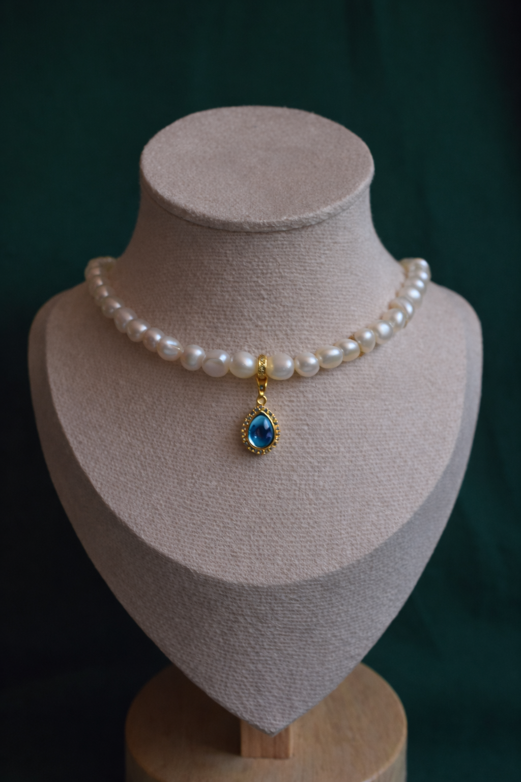 Freshwater pearls accompanied by deep midnight blue - quiet, soft, and marked by lasting clarity.