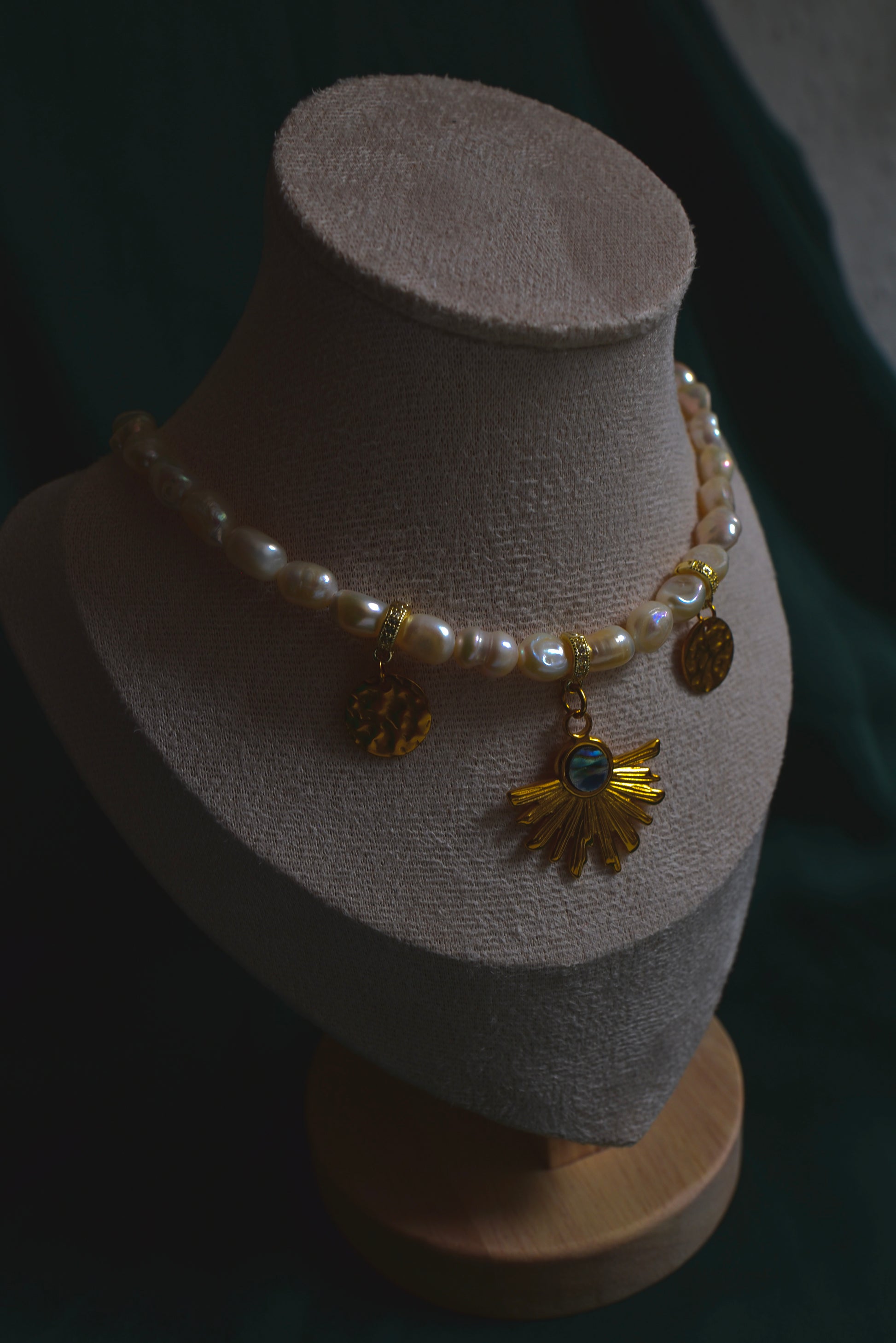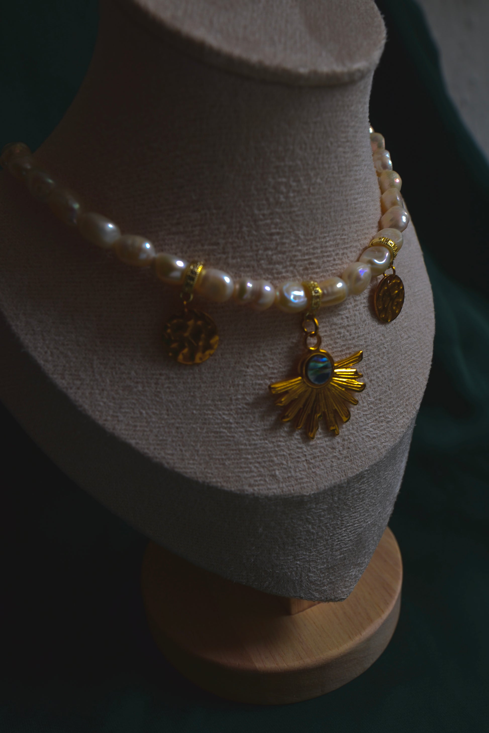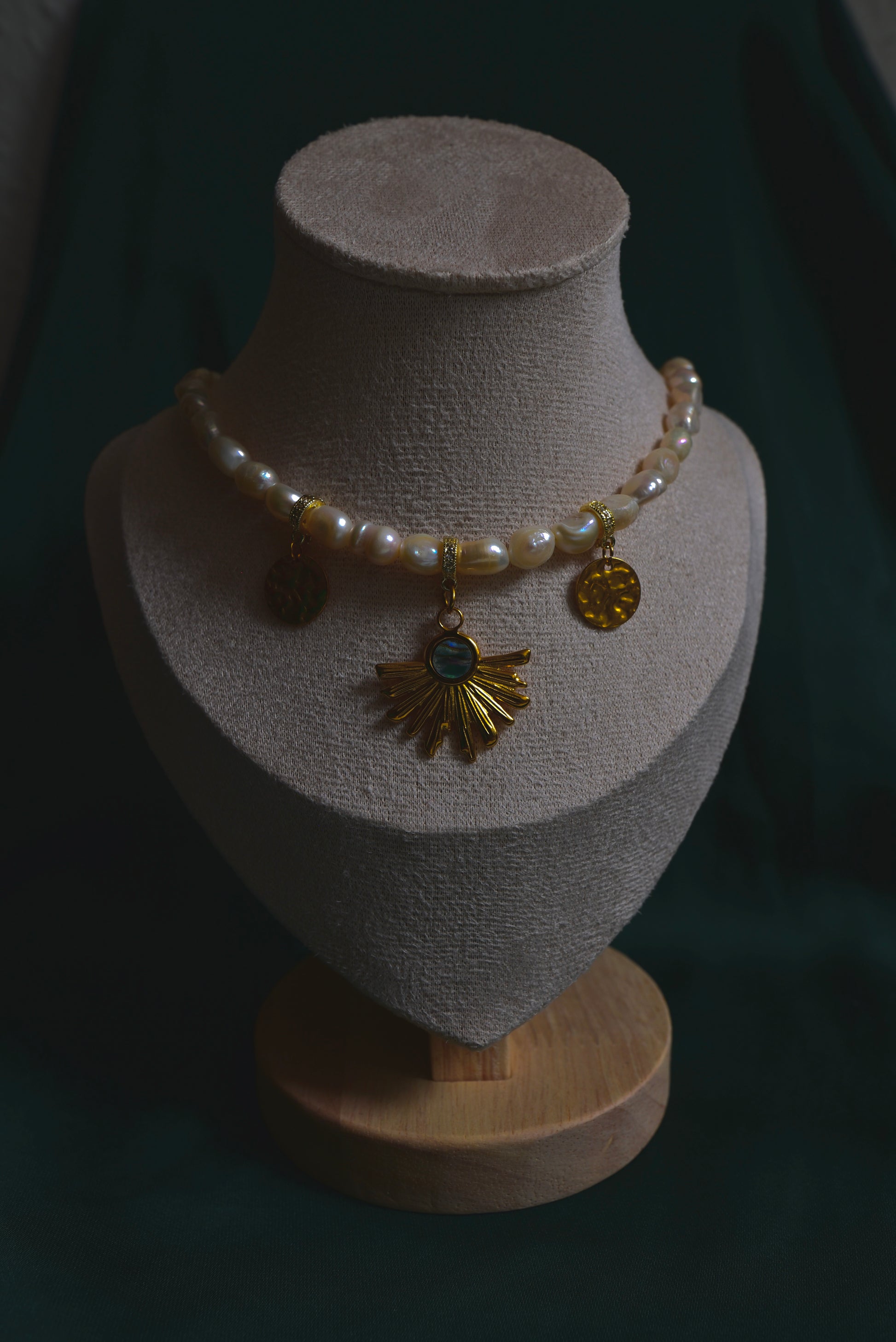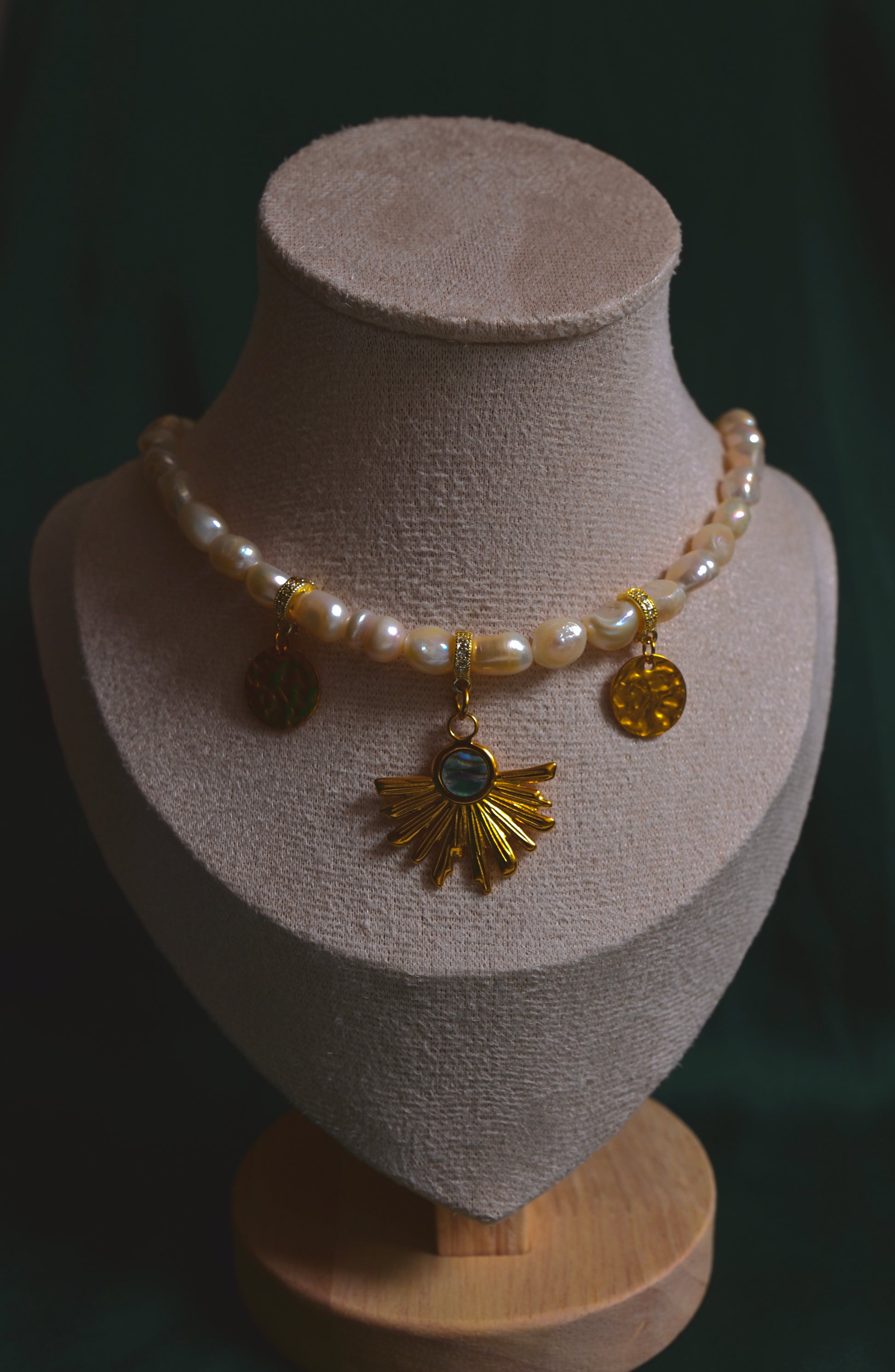 Пресноводный жемчуг, тихо светящийся, в центре которого — восходящее солнце из золота.