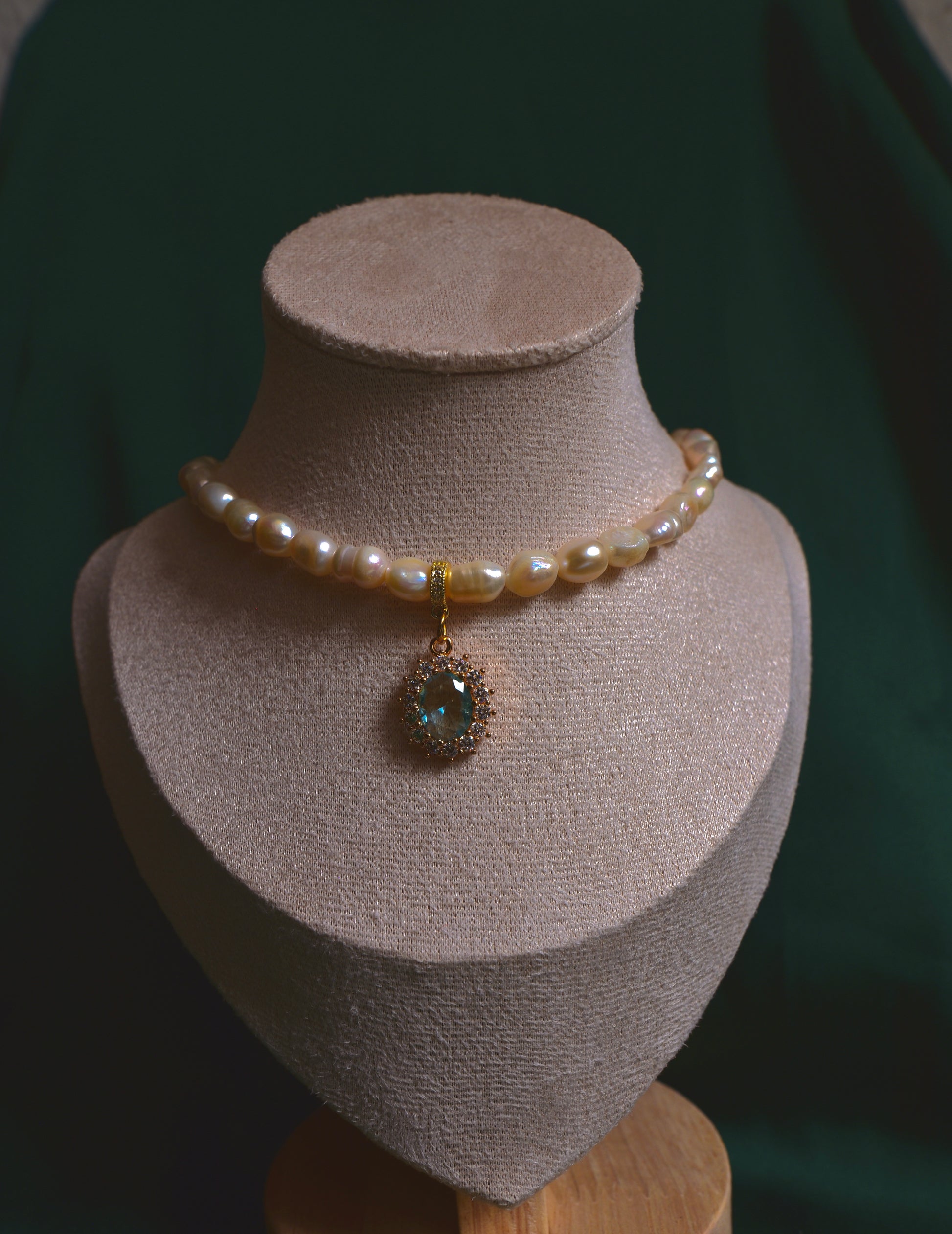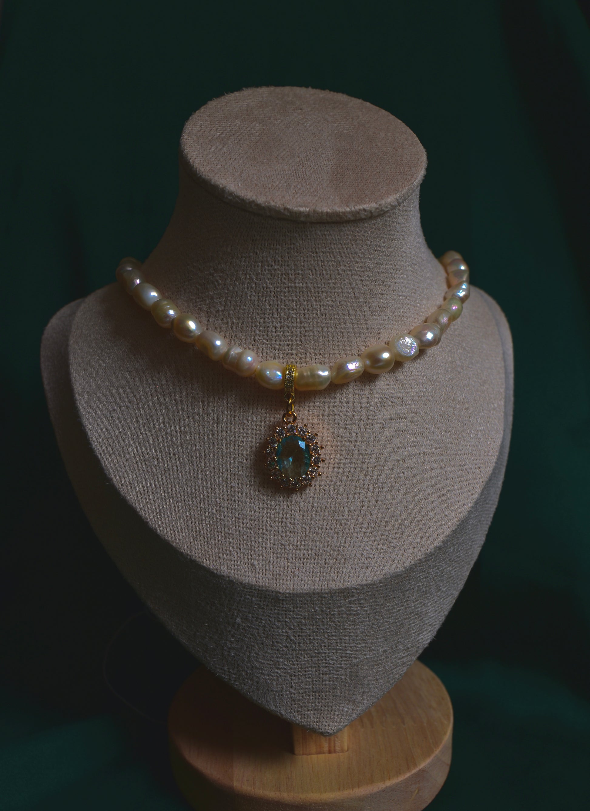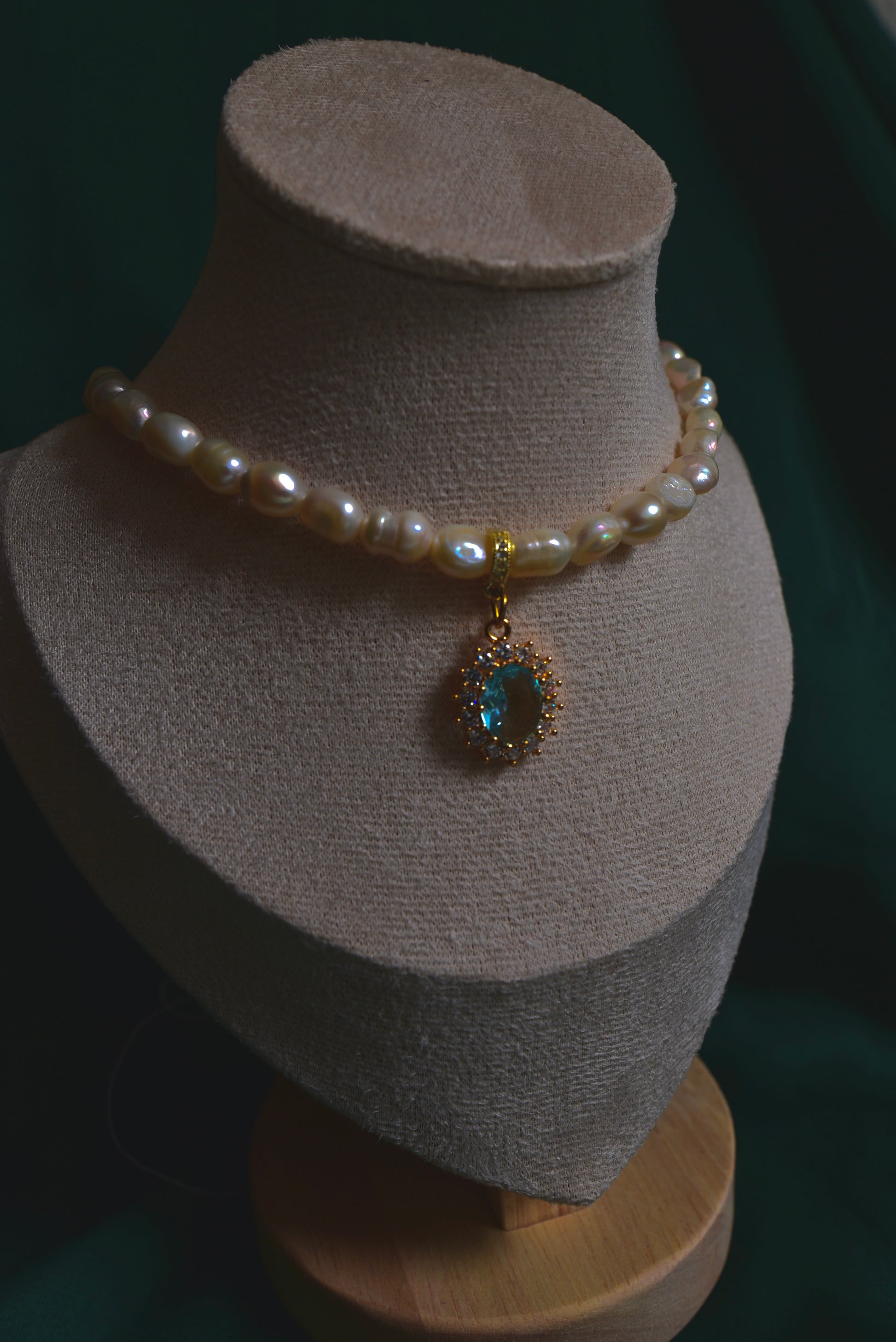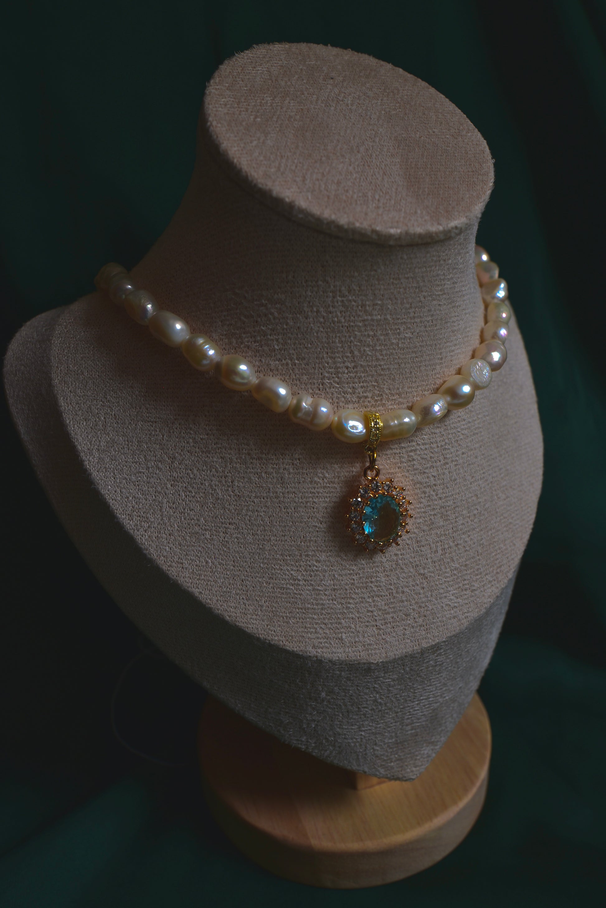 Пресноводный жемчуг с одним синим камнем, оправленным в золото, словно воспоминание о звезде.