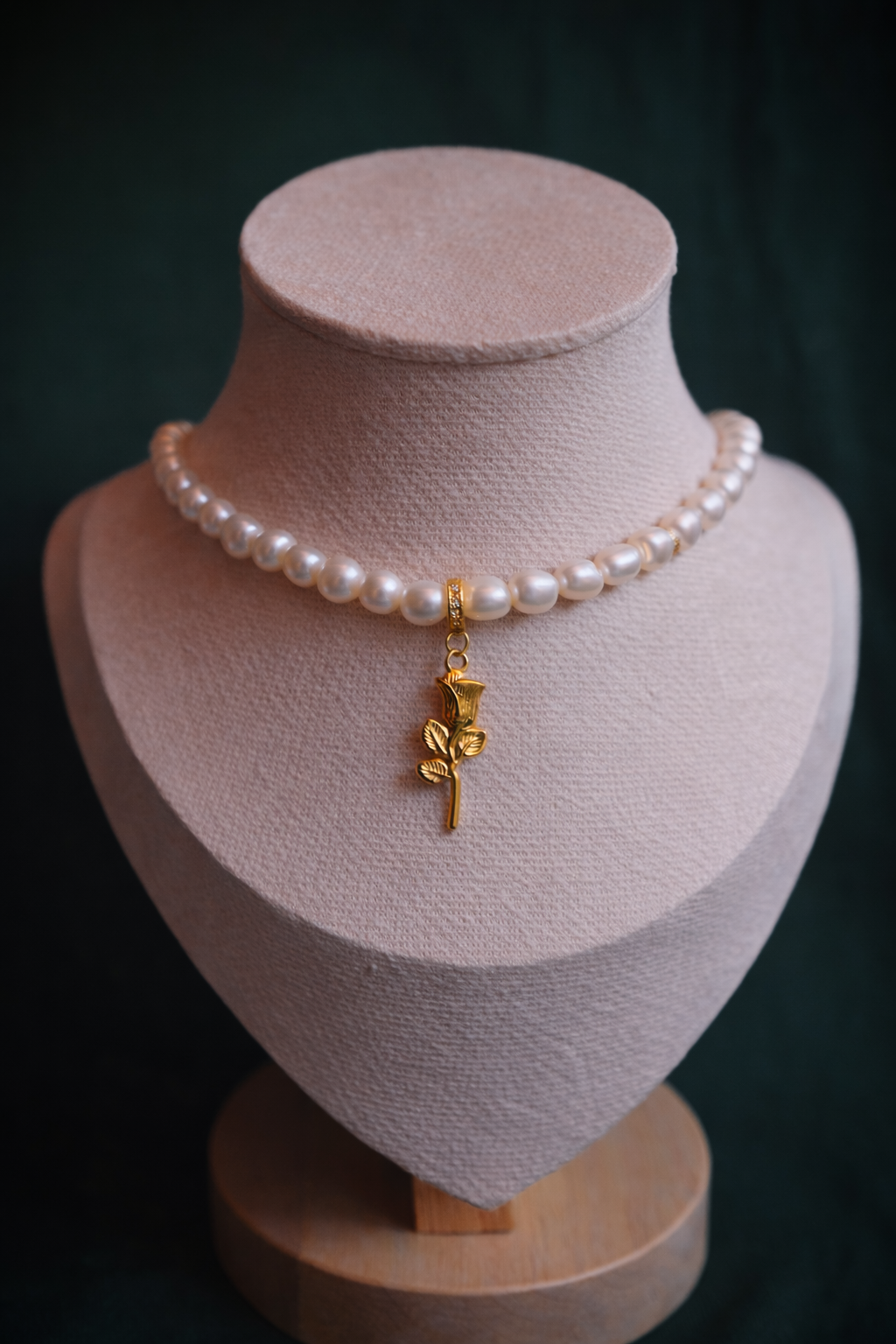 Пресноводный жемчуг и нежные капли нефрита окружают одну золотую розу.